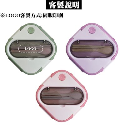 尺寸:約19x19x7.5cm 容量:約1000ml 材質:內膽-304不鏽鋼 外殼、提把、餐具-PP塑膠 密封層-矽膠圈 顏色:綠、粉、紫 包裝:彩盒 ※LOGO客製方式:網版印刷 ※印刷尺寸:印上蓋:10x2.5cm