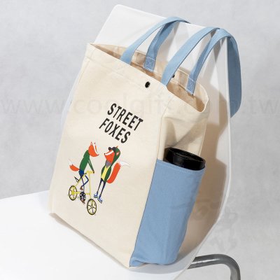 材質:本體本白帆布12盎司,兩側口袋與長提帶染色帆布 尺寸:長26.4x高33x底&側寬12cm+長提帶 (因材料縮率以及人工車縫,成品尺寸誤差正負5-8% 為正常範圍) 提帶+側邊顏色:紅、淺藍、深藍、黑 包裝:散裝,每20個入一塑膠袋 ※LOGO客製方式:Logo全彩燙印 ※印刷尺寸:約27x17cm