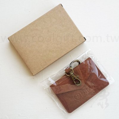 材質:合成皮 規格:前袋證件窗、背面掀蓋式口袋 尺寸:皮套-約10.5x7cm;證件窗-約8.2x4.8cm 顏色:棕 包裝:牛皮盒 特色: 1.臺灣製造 2.可當證件套、票卡夾、名片夾、零錢包等多功能用途 ※LOGO客製方式:烙印 ※印刷尺寸:約8x2cm ※產品上圖文標章僅供參考若欲使用須取得授權