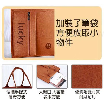 尺寸:約25x15xH35cm±2.5cm 顏色:黃、咖、灰 特性: 1.加裝了筆袋,方便放取小物件 2.優質毛氈材質,耐磨耐用 3.大開口、大容量