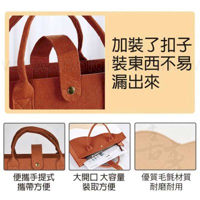 尺寸:約35x15xH25cm±2.5cm 顏色:咖、紅、黑 特性: 1.加裝扣子,東西不易掉出 2.優質毛氈材質,耐磨耐用 3.大開口、大容量