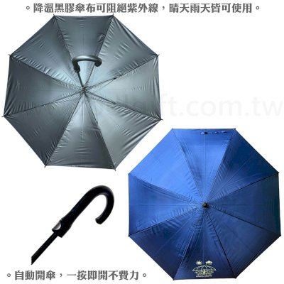材質:降溫黑膠傘布、全纖維防風傘骨 尺寸:137cm 8K傘骨(±5%) 包裝:pp袋裝 特點: 1.人體工學握把+大傘面 不怕豪雨攜帶方便 2.可阻絕紫外線。晴天雨天皆可使用 3.防風骨架,結構堅固具彈性 4.自動開傘,一按即開不費力