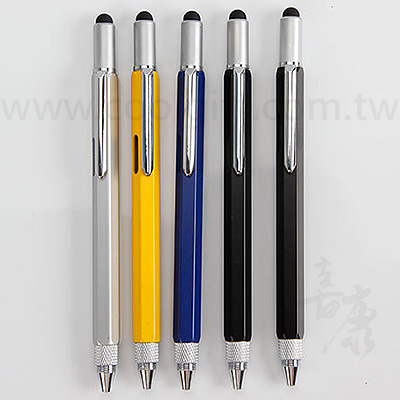 規格:六合一多功能工具筆 外殼材質:金屬 筆芯色:黑芯 尺寸:含觸控筆長約15.5cm 包裝:開口透明袋 特點: 多功能設計,原子筆/觸控筆/筆身具尺標/筆頭旋轉開為螺絲起子。 細緻設計,書寫流暢,耐用、精工鍍烙筆夾,簡潔光滑。 ※LOGO客製方式:雷雕 ※雷雕尺寸:約5x0.3cm