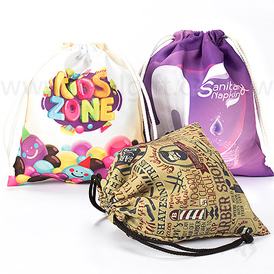 柔軟斜紋布束口小物袋福袋禮物袋拉繩在上(全版全彩昇華) 150D 柔軟斜紋布,全彩昇華滿版印刷在束口袋的雙面。