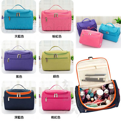 顏色:粉紅/桃紅/綠/天藍/深藍/紫色 材質:滌綸 特色: 大容量裝多多、可掛可提輕鬆收納、旅行便攜