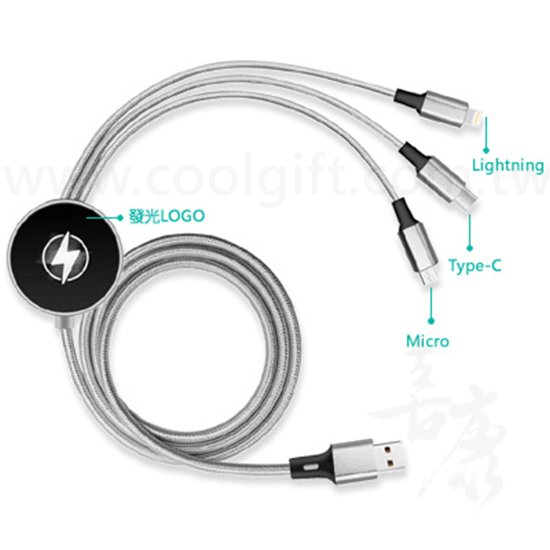 客製化發光LOGO三合一充電線 採用Type-C Micro USB和Lightning三合一設計 可同時為多種裝置充電 充電線上的LOGO可客製化 是企業禮品和個人使用的不錯選擇