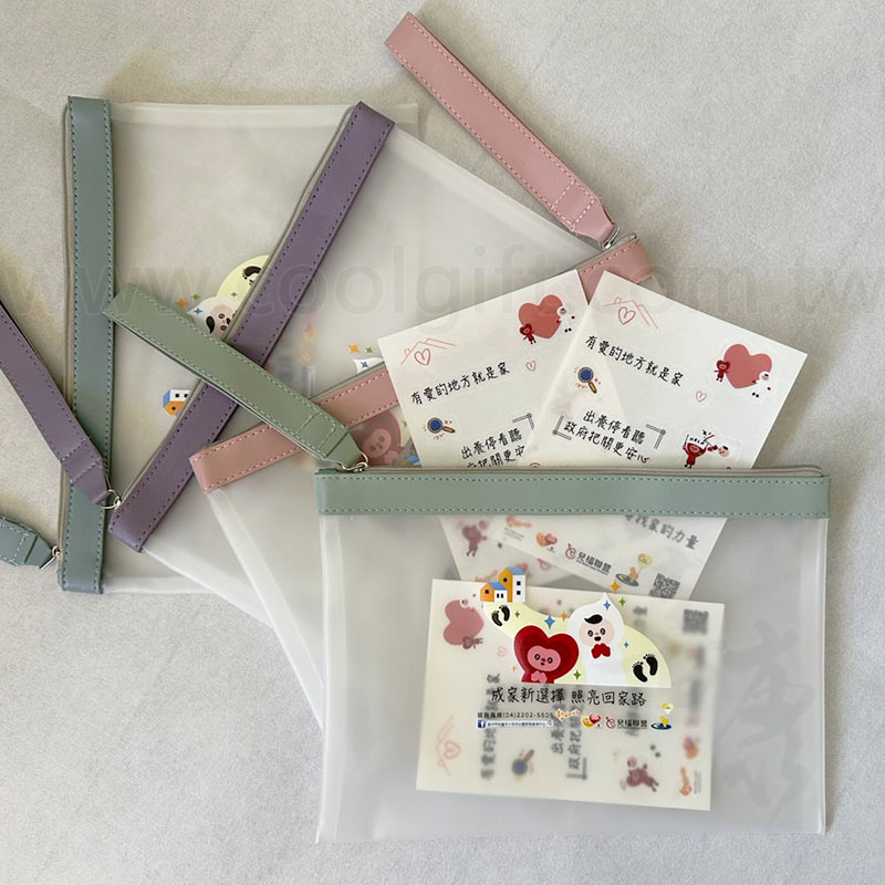 半透明磨砂資料袋A5 尺寸:A5約25x18cm 顏色:粉、綠、藍、紫 ※LOGO客製方式:彩色印刷 ※印刷尺寸:約10x10cm 雷射切割造型透明貼紙 尺寸:A6約10.5x14.8cm 上光方式:亮膜 包裝:散裝(OPP袋須加購) ※產品上圖文標章僅供參考若欲使用須取得授權
