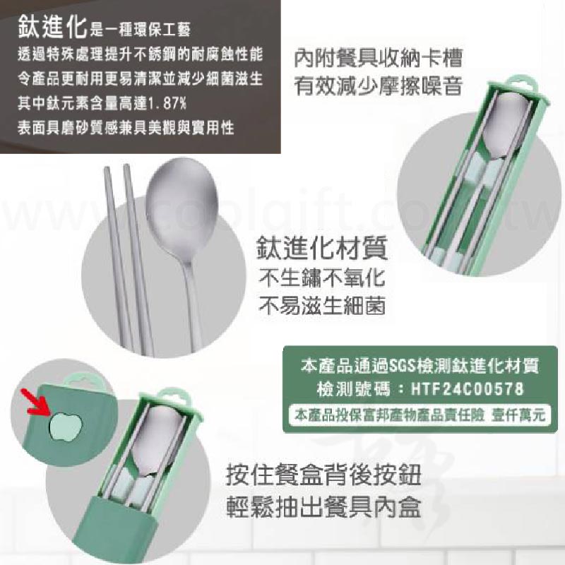 材質:餐具-304不鏽鋼鈦進化 收納盒-塑膠PP 尺寸:收納盒-約5.2x21.3x2.5cm 湯匙-約長18.8x寬3.9cm 筷子-約長18.7cm±5% 顏色:綠、藍、粉 包裝:彩盒 特性: 1.鈦進化材質-不生鏽不氧化、不易滋生細菌 2.內附餐具收納卡槽,有效減少摩擦噪音 3.按住餐盒背後按鈕,輕鬆抽出餐具內盒 ※本產品通過SGS檢測鈦進化材質 ※鈦進化是一種環保工藝,透過特殊處理提升不銹鋼的耐腐蝕性,能使產品更耐用更易清潔並减少細菌滋生,其中鈦元素含量高達1.87%,表面具磨砂質感兼具美觀與實用性