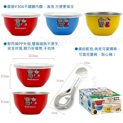 尺寸: 匙-約2.6x10.4cm 碗-約12.5xH6.3cm(含上蓋) 容量:約300ml ※以上規格±5% 材質: 內膽-304不鏽鋼 外殼-聚丙烯(PP)+SBC樹酯 上蓋-聚丙烯(PP)+SBC樹酯 包裝:彩盒 產地:台灣 ※混色出貨