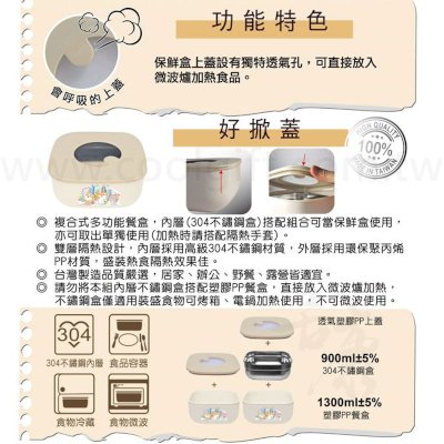 尺寸 : 長16×寬16×高7.6cm±5% 材質 : 聚丙烯PP、304不鏽鋼(不可微波) 產地 : 台灣 容量 : (不鏽鋼盒)900ml±5%、(塑膠餐盒)1300ml±5% 包裝 : 彩盒 ※請勿將本組內層不鏽鋼盒搭配塑膠PP餐盒直接放入微波爐加熱,不鏽鋼盒僅適用裝盛食物可烤箱、電鍋加熱使用,內層不鏽鋼盒不可微波使用!